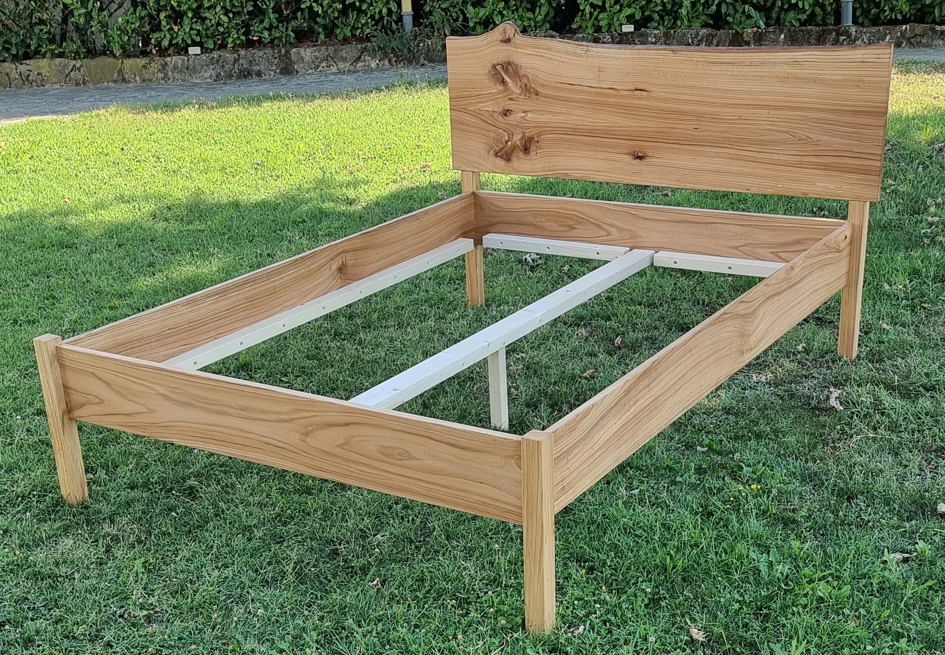 Questo letto dalle linee semplici e pulite è stato costruito interamente in legno massello di olmo. Il punto focale è la testata, ricavata da un'unica tavola dalle bellissime venature che...